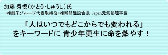「裏街道を歩んできたからこそ解る、立ち直ることの難しさ、社会復帰までの孤独。現在その境遇にある若者を育てることが、 今までの悪事を償う意味でもあり、僕の使命――」と語るのは、社会起業家の加藤秀視氏です。