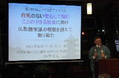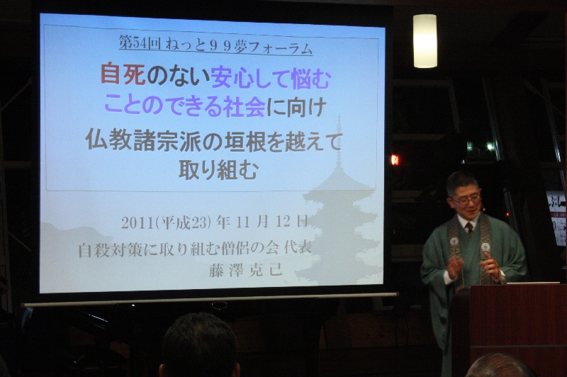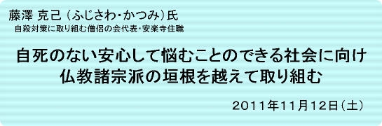 13年連続3万人以上の自殺(自死)者を出す日本にあって、僧として“死”だけでなく“生”(“いのち”)の問題に向き合う藤澤師から「自殺をしないですむ」社会づくりの取り組みについて聴きたいと思います。