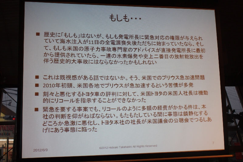 それにしても緊急時の「権限」の在り所と使い様には、改めて愕然としました。原発の吉田所長はその後如何に?お話を聞きたいものです。「修羅場経験の勧め」「半分ある水か半分しかない水か」には同感。白か黒か、イエスかノーかの前に「なんでもあり」の現在を「あれもある、これもある」と方法を見出し、「想定外」をつくらないこと。「技術屋の意地」と「権限」の融合は有り得ないのか。縦割りに陥らない分立を保ちながら、多言・直言し合う事でしょうね。これからは「知恵ある一般人」を目指し、ベストリーダーを逆指名できるよう研鑚したいものです。