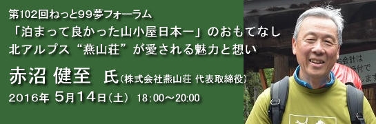 コーヒー、ケーキを楽しみ、展望喫茶室でくつろげる他、オーナーのアルプホルン演奏と山の話、登山教室、バイオリンコンサート、ケーキフェアなど、登山者に最高の思い出となるおもてなしがファンを集めています。燕山荘を支え、他にも複数の小屋を経営する赤沼氏の話を伺い、その歴史と魅力に触れます。