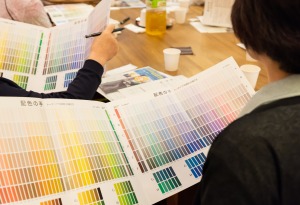 門田氏は国内のほか世界53か国、250都市の色彩を調査した結果をもとに、配色表「配色の手」を作成した。同配色表は、多くの人が感じる快適配色を選択基準に構成したもので、色彩の知識をもたない人でも簡単にイメージに合った配色が行えるのが特徴。色彩をウォームカラー、クールカラー、ジョイントカラーの3グループに大別し、塗ろうとする色彩を選べば、それに合う色がすぐ見つけられる。心地よい街並み・建築は配色に秘訣があり、▽自然界の色が使われている▽ウォームカラー・クールカラー同士で配色▽トーンが同一か類似―などの共通項があるという。門田氏は日本の建築物の配色は無難過ぎる点やトーンが明る過ぎることを指摘。特に内装には少し濃い目の配色を用いると人物を引き立たせる効果があることを説明した。また、コンピュータによるカラーシミュレーションの場合は、前段階で「配色の手」を利用し、最終的には塗り板見本でプランニングすることを推奨した。