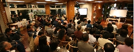 - 今回の講演会には、“ウーマン・オブ・ザ・イヤー2002”大賞のセーラ・マリ・カミングスさんが登場。このまるっきりアメリカ人の彼女は、これまで、主に海外で行われていた「国際(葛飾)北斎会議」を日本で開催させるために奮闘したり、自身が酒造メーカー(長野県小布施町)に勤めていることもあり昔ながらの“木桶づくり”を今に蘇らせたり、「小布施見にマラソン」を実現……などなど、勤務先の活性化だけではなく、小布施の町づくりにも貢献してきていたのだ。