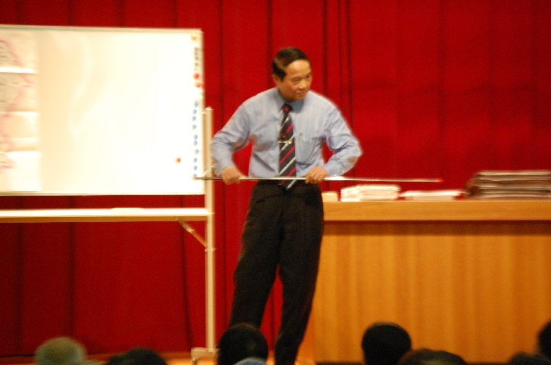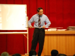 - 元気いっぱいの熊本弁と身振り手振りのパフォーマンスで熱弁を振るい、次々に墨痕鮮やかな活字・数字を掲示し……、こんなことで驚いてはいられない。勢いあまって、ステージから客席まで飛び降りてきてしまう。こんな元気いっぱい、笑いいっぱい、感動いっぱいの講演会は今までみたことがない。大畑先生は、私たち聴く者の心を釘付けにしてしまった。本当に、たまがった。(熊本弁で、「驚いた」)
